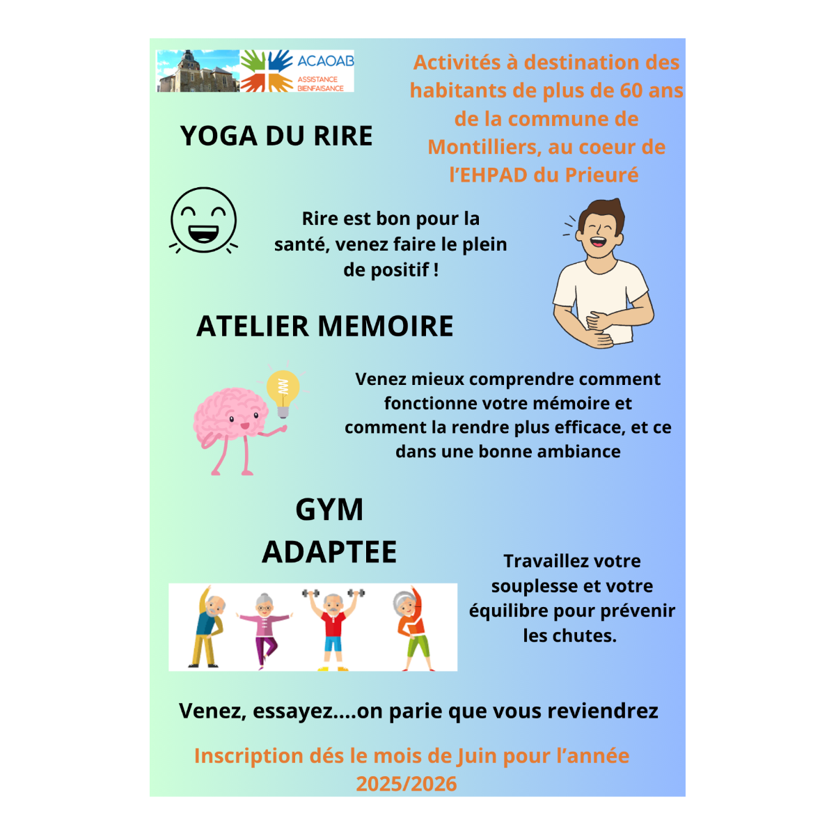 Au cœur de l'Ehpad : Yoga du rire ; Atelier mémoire ; Gym adaptée.